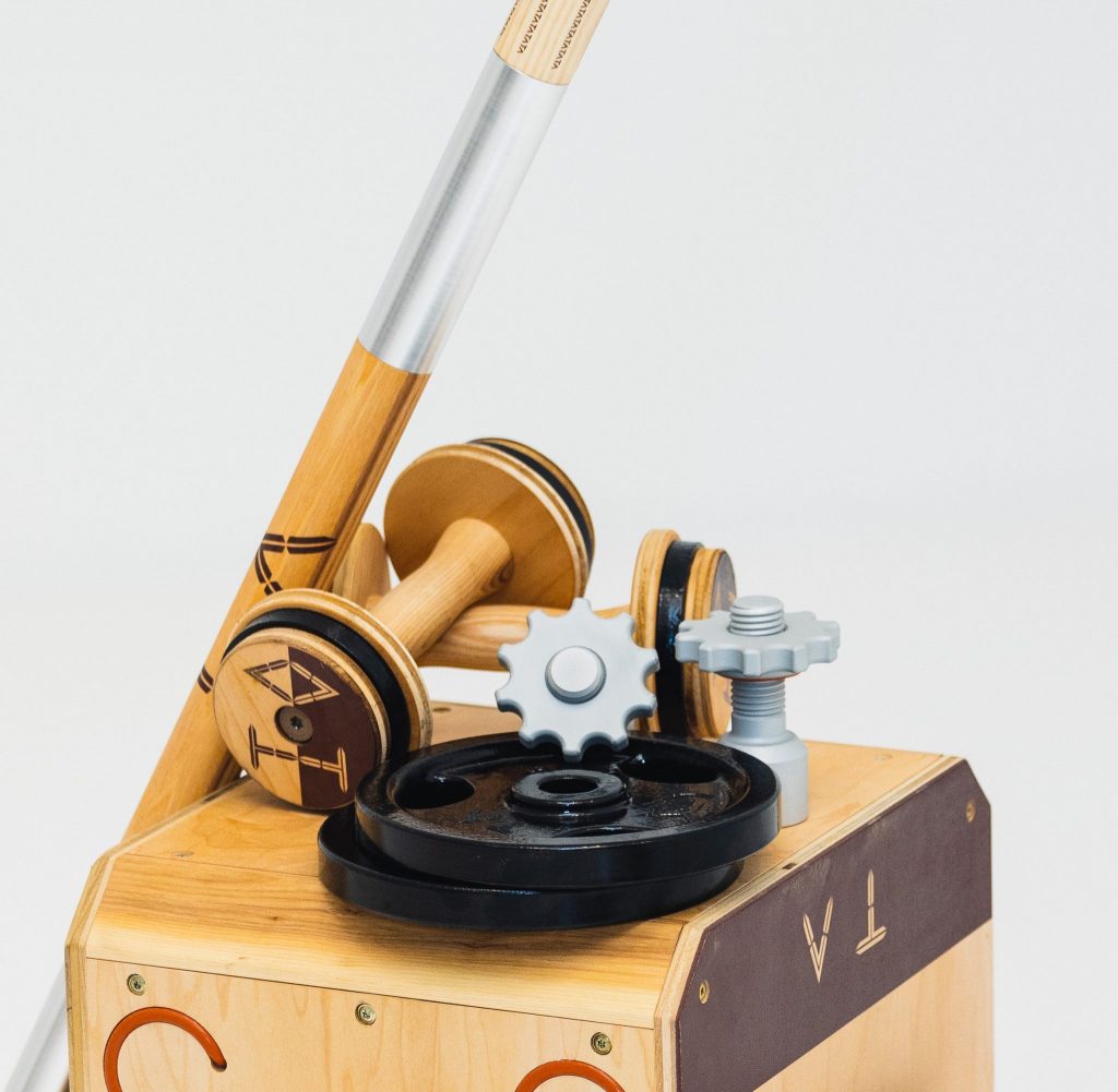 The individual pieces of the MYMODE apparatus come together in an eco-conscious wooden box with four different levels, which serves as the platform for the workout. With a custom-tailored staff socket, the workout platform was designed to enable multidirectional movement.