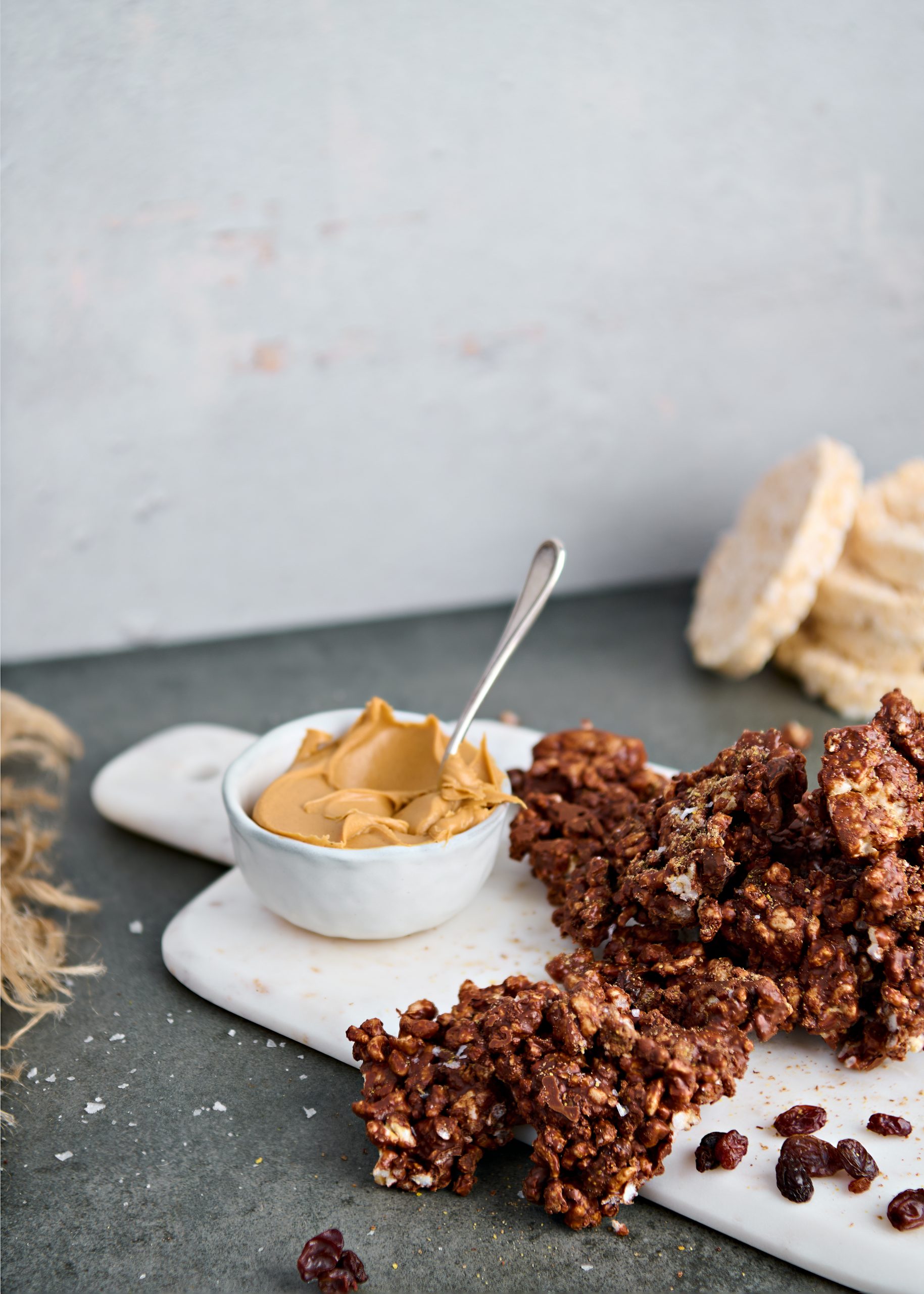 - In a medium bowl, break the rice cakes into small pieces. Add the raisins, ground flax seeds, and flaky salt.